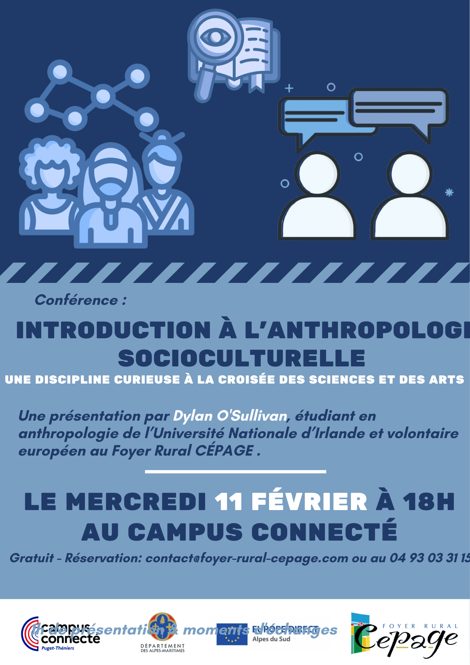 Rendez-vous le mercredi 11 février à 17h45, au Campus connecté de Puget-Théniers, pour une présentation d’anthropologie socioculturelle. Elle sera animée par Dylan O’Sullivan, étudiant à l’Université Nationale d’Irlande et Volontaire européen aux Foyer rural CEPAGE.